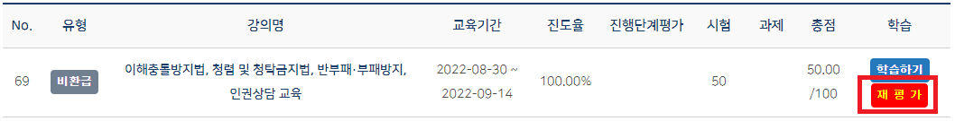- 재평가 대상 과정은 내강의실에서 학습하기 위치에 재평가라고 안내버튼이 활성화 되어 있습니다.