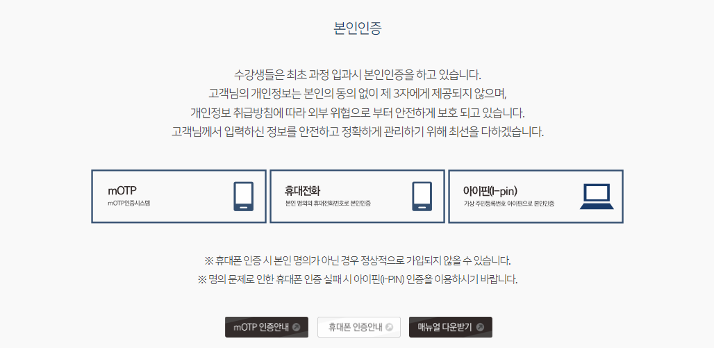 ① 원격훈련과정 최초 입과시 : 기존에는 본인명의 휴대폰, IPIN만 인증이 가능하였으나, 대체인증수단으로 mOTP가 추가되었습니다. 단, 본인 명의 휴대폰에 mOTP를 설치해야 합니다.