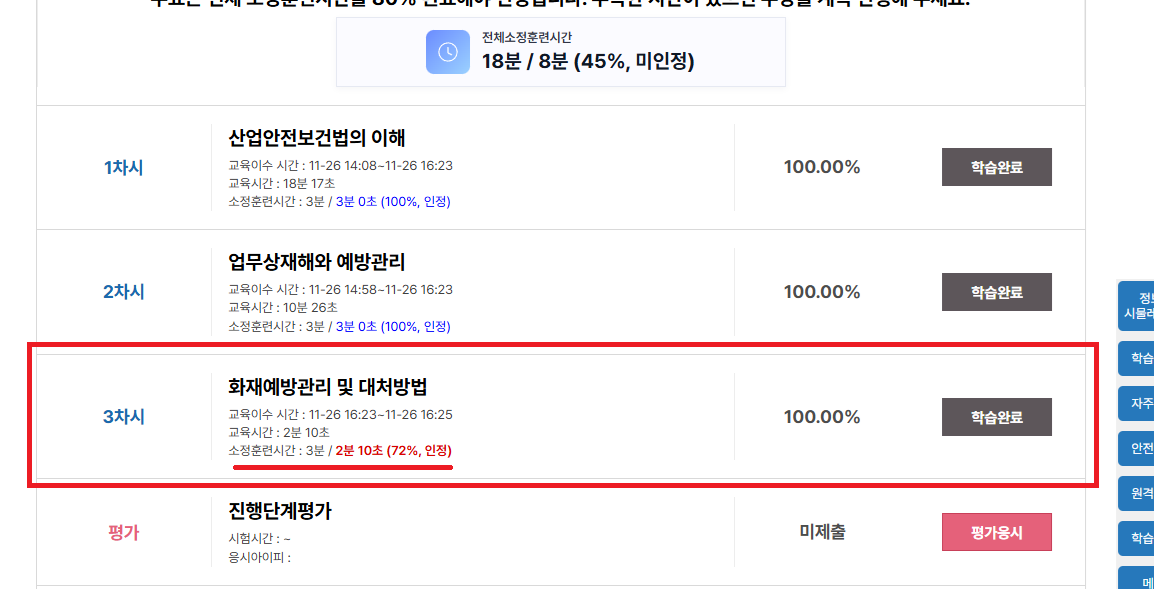 기존 모든 차시 학습이 100%로 인정될 경우 평가진행 및 수료가능 신규 모든 차시 학습시간의 최소 80%이상을 수강해야 평가진행 및 수료가능 그리고 학습시간은 각 차시별 정해진 학습시간외는 인정이 되지 않습니다. 1차시가 25분일경우 1시간을 듣더라도 25분까지만 인정이 됩니다. ※ 각 차시별 학습이 100%로 나오더라도 소정시간의 80%를 충족하지 못하면 평가참여가 불가능 합니다. <학습페이지 화면>