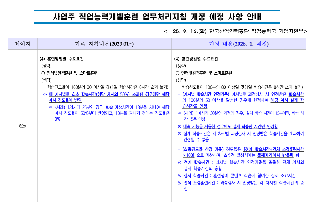 <사업주 직업능력개발훈련 업무처리지침 개정 안내> ![]() <학습인정기준> 기존 1차시 학습시간이 30분일 경우 15분만 학습해도 학습으로 인정 신규 1차시 학습시간이 30분일 경우 80%인 24분 이상 학습을 해야 학습으로 인정