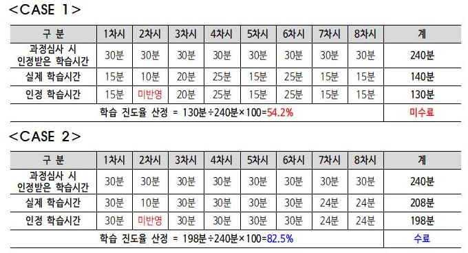 해당 내용은 직업능력개발훈련의 "사업주훈련" 또는 "국민내일배움카드"에만 적용이 됩니다. 기존 직업능력개발훈련은 각 차시별 학습시간의 50%이상만 수강하면 학습이 인정되었습니다. 하지만 정책의 변경에 따라 2026.1.1. 부터는 전체 소정시간의 80% 이상을 수강해야만 학습이 인정이 됩니다. 그리고 기존에는 과제는 선택이였지만, 이제는 과제를 필수로 참여해야만 수료가 인정이 됩니다. 그 에 따라 시스템이 변경 적용되었으며, 2025.12.03.일 직업능력개발훈련과정부터 해당 기준이 적용이 됩니다.