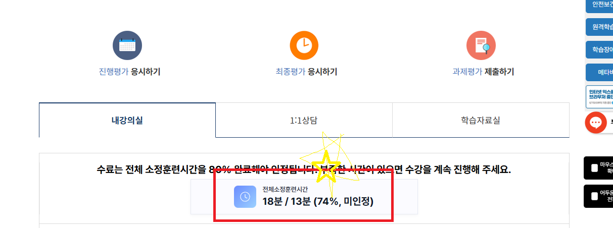 ![]() <전체 소정 훈련시간의 80% 미만시 최종평가 및 과제진행 불가> <전체 소정시간 확인 위치> ![]() <산업인력공단 신규 진도인정 예시> ![]()